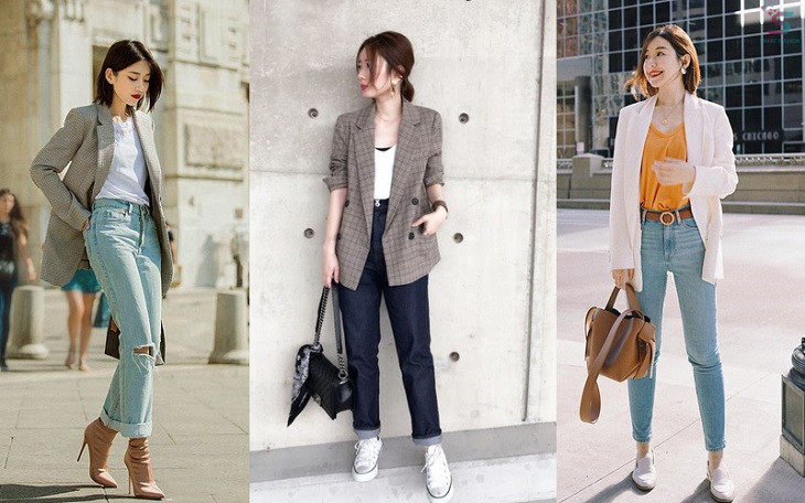Việc kết hợp áo blazer cùng áo phông và quần jeans sẽ giúp các nàng tạo được set đồ năng động, thời thượng và rất bắt trend. Hơn hết, chị em còn có thể khoe trọn được đôi chân thon thả nhờ quần jeans và màu sắc tươi mới mà những chiếc áo thun mang lại. Đối với công thức phối đồ đơn giản này, các nàng đừng quên nhấn nhá thêm bằng những đôi sneaker hoặc giày cao gót để tạo thêm sự thanh lịch và sành điệu hơn nhé.