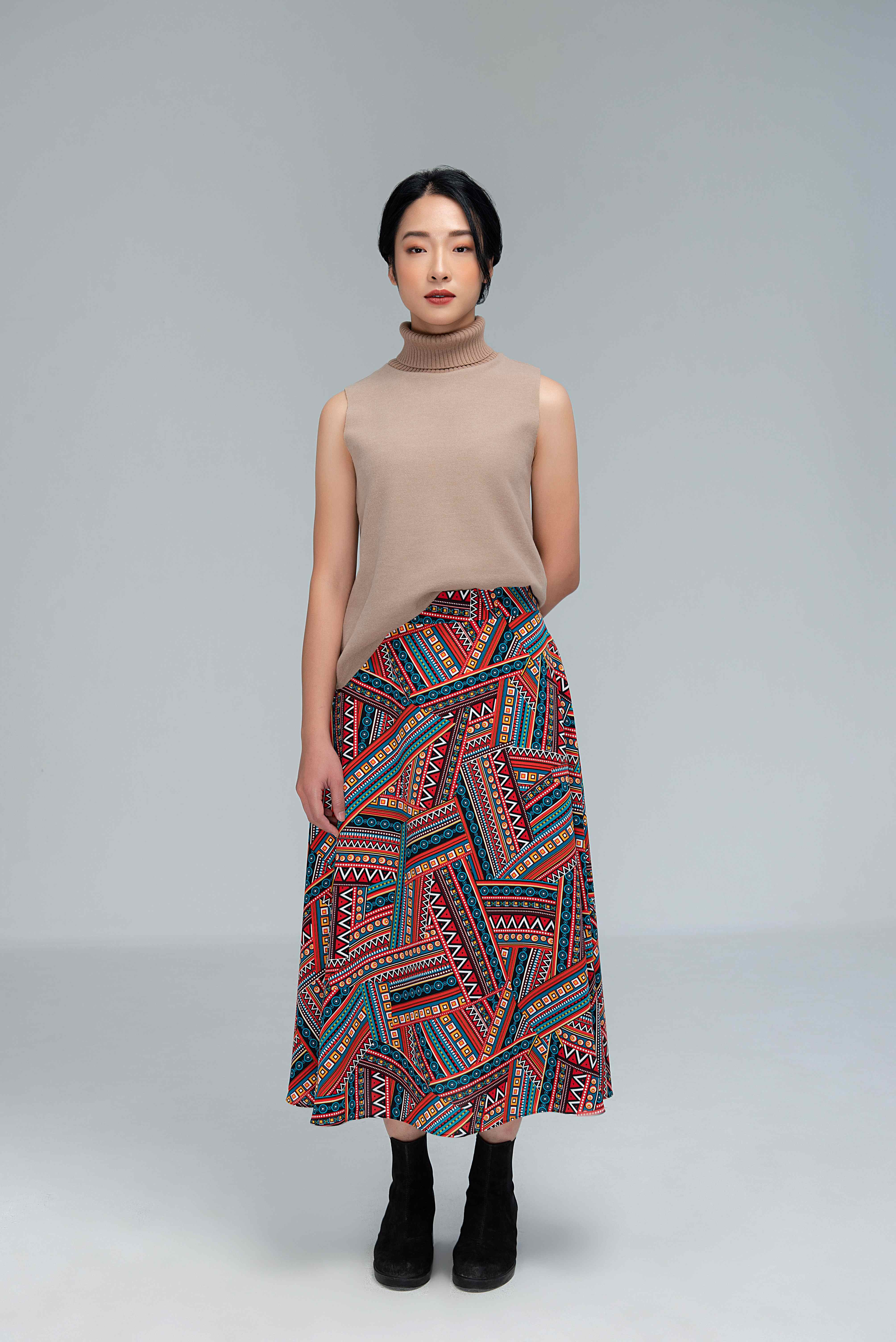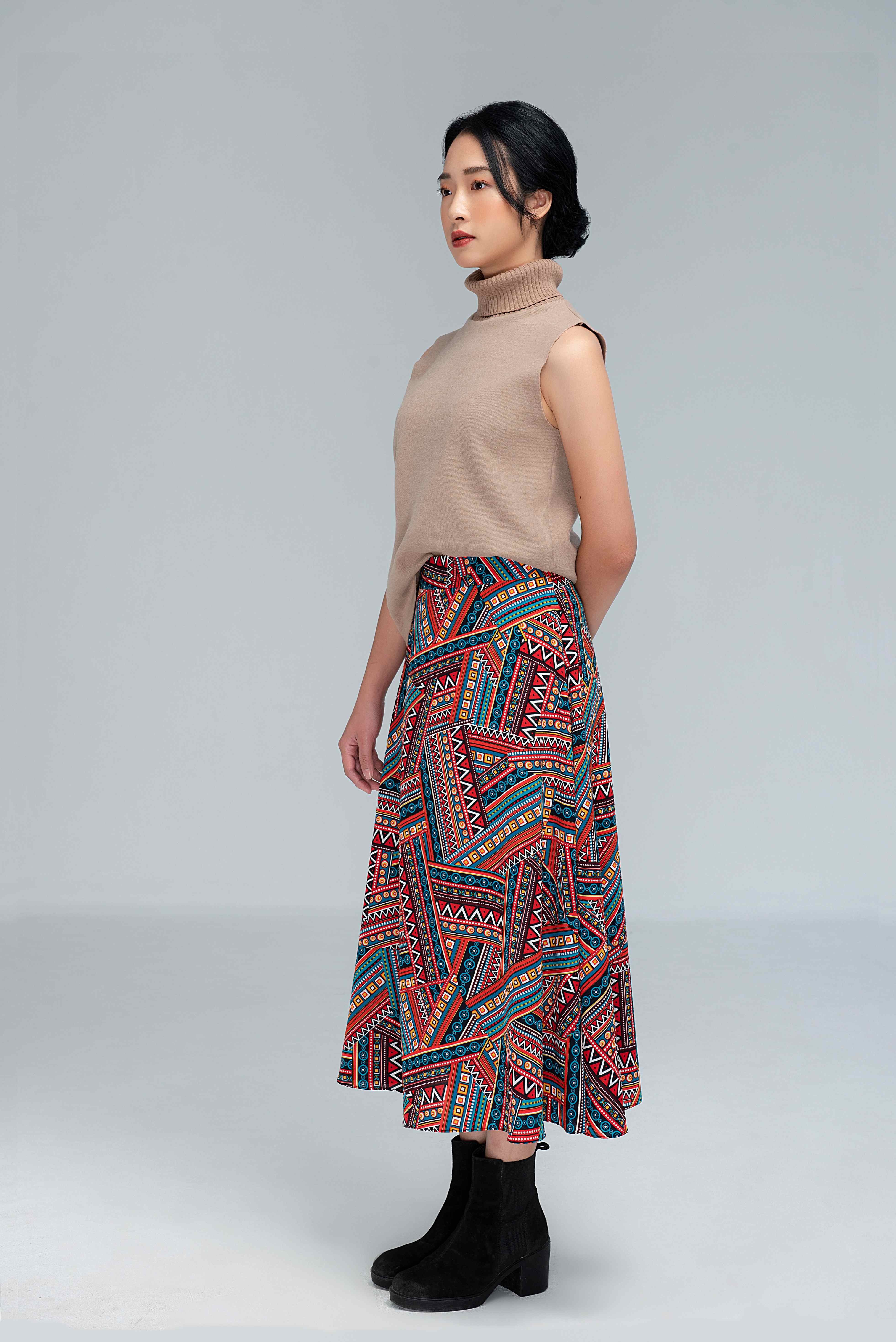 Chân váy chất liệu lụa chiffon mềm rũ, dáng midi dài tới mắt cá chân, xòe vừa, chân váy có lót lụa bên trong, khóa ẩn phía sau.