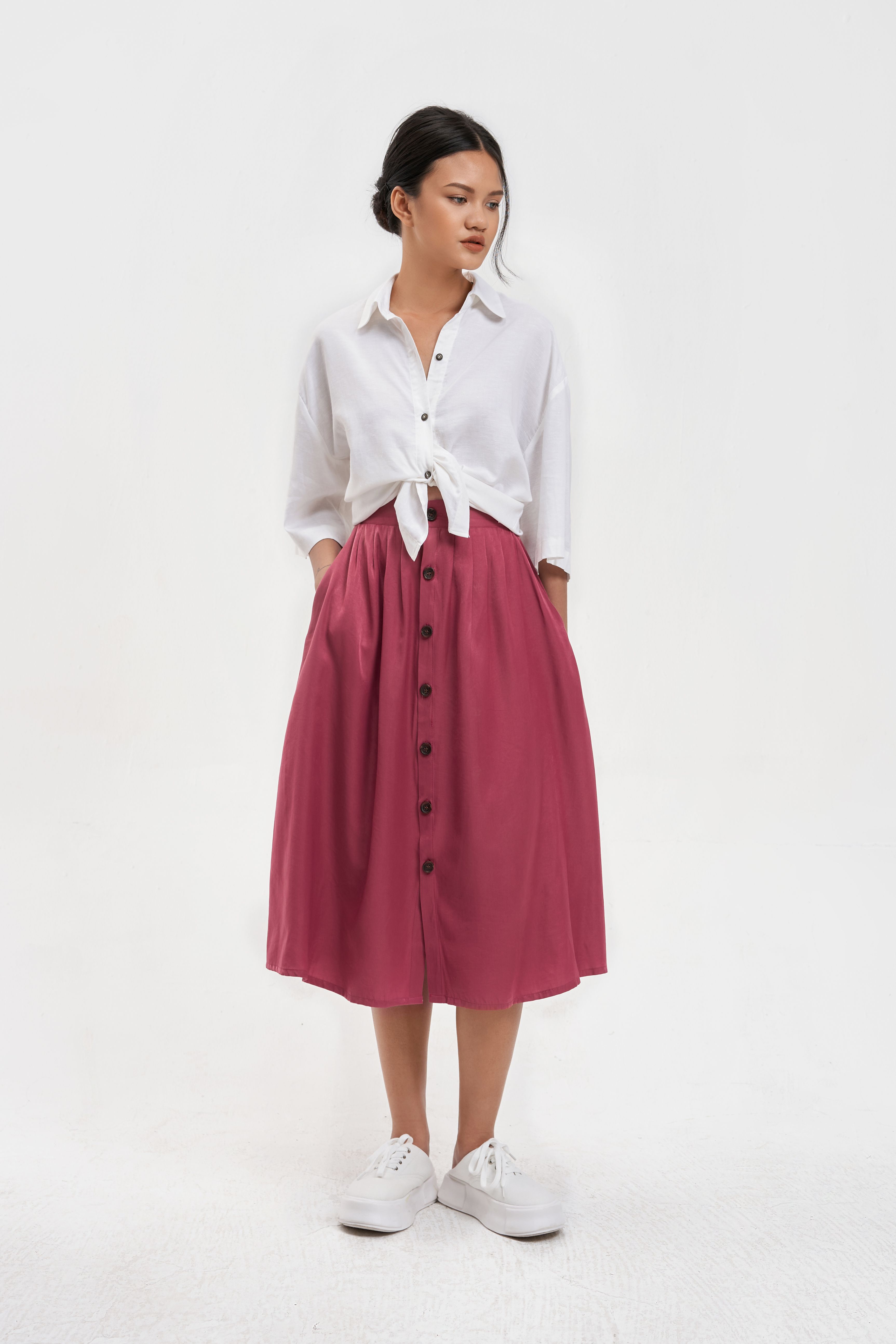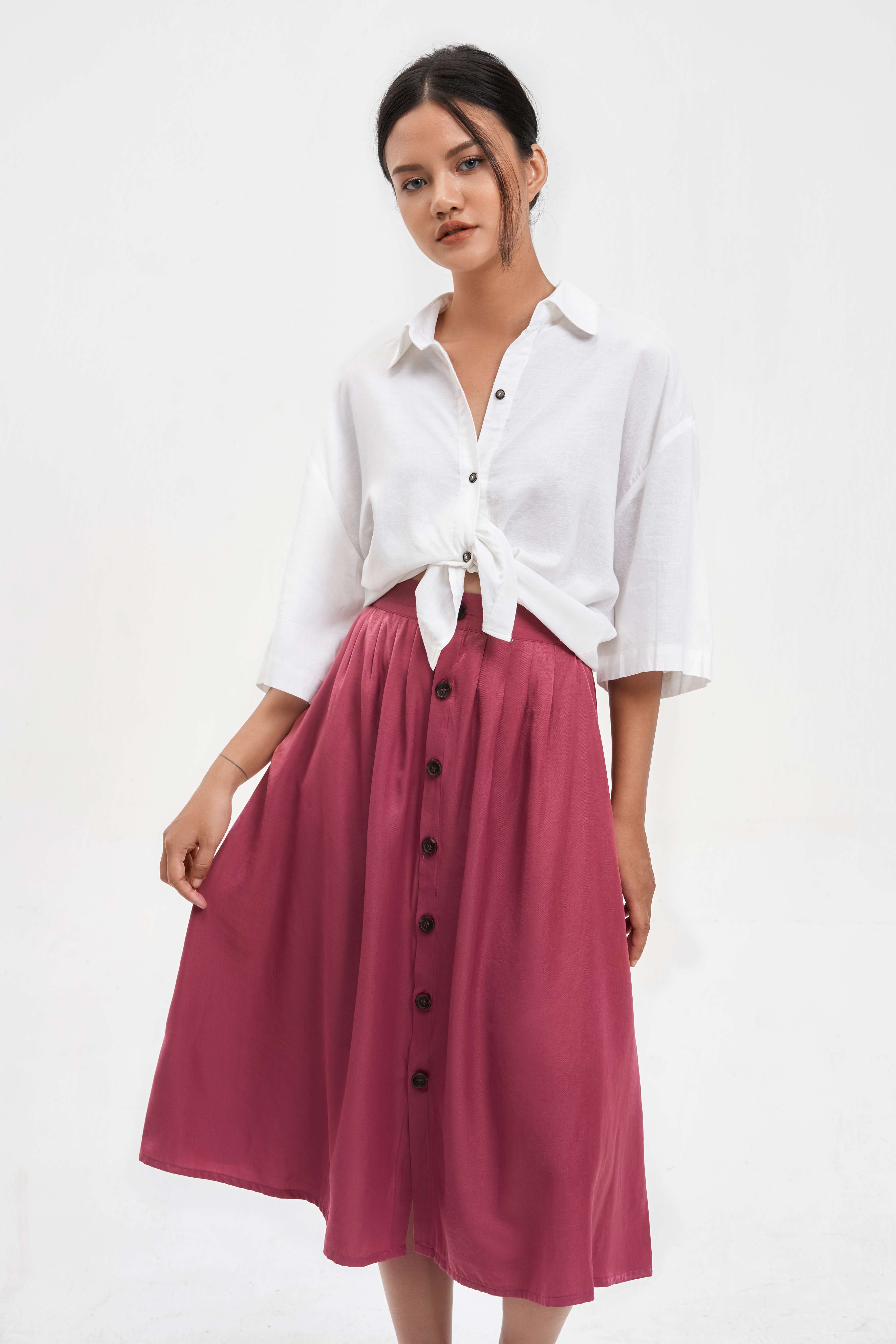 Chân váy xếp ly chất liệu lụa tằm chéo, mềm, mượt, nặng tay. Thiết kế xếp ly thân trước và thân sau, cạp rời, Cúc và 2 túi chéo thân trước.
