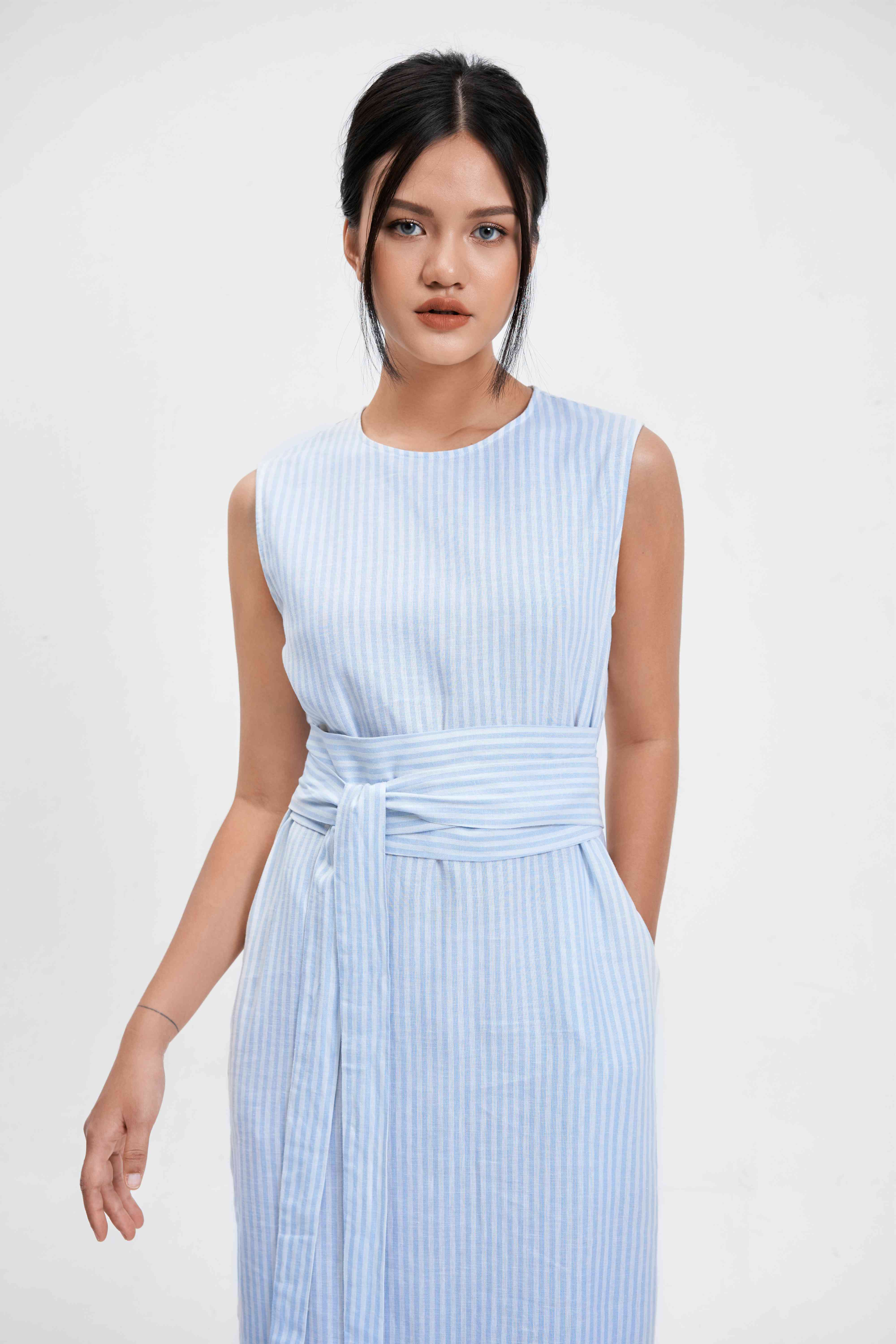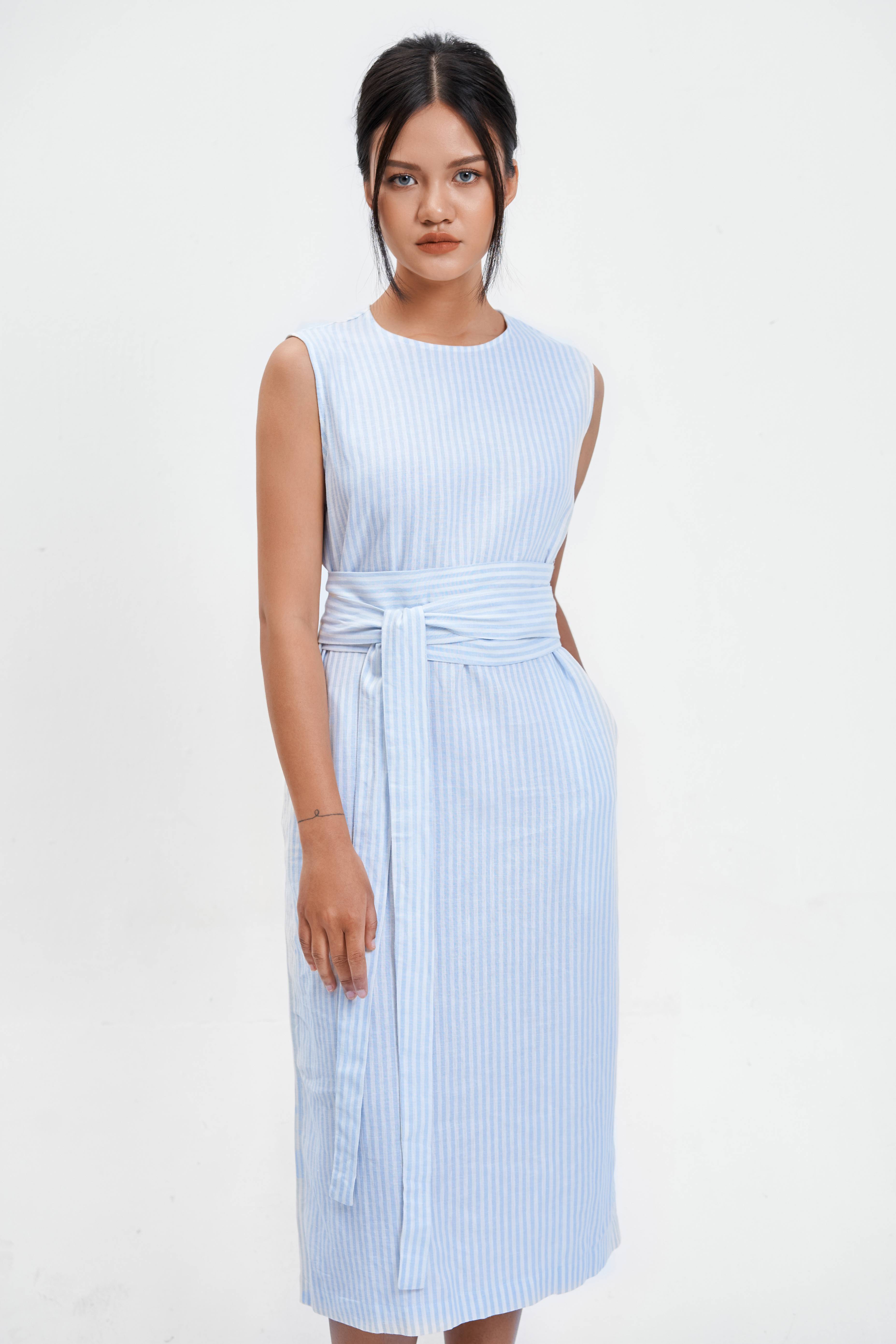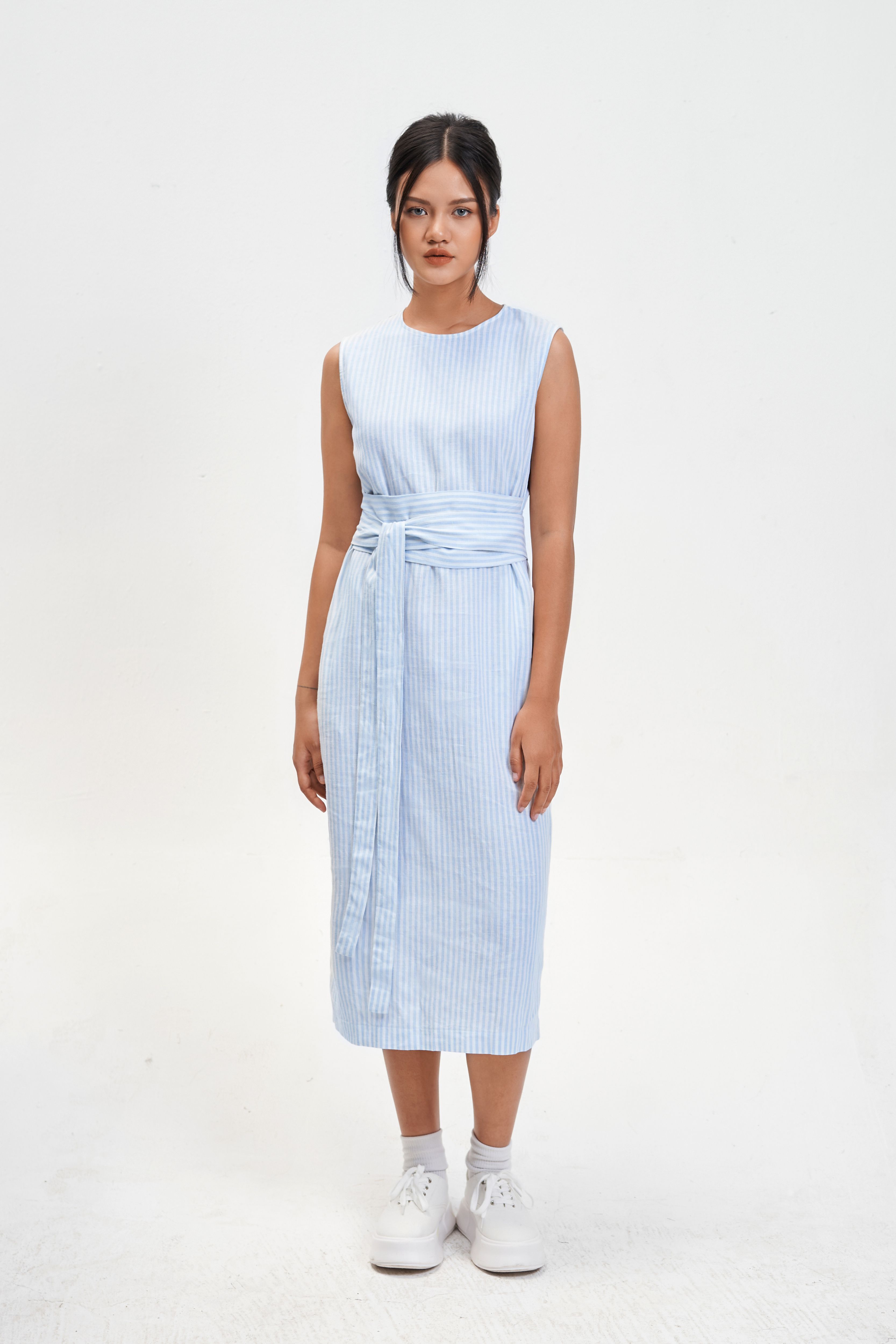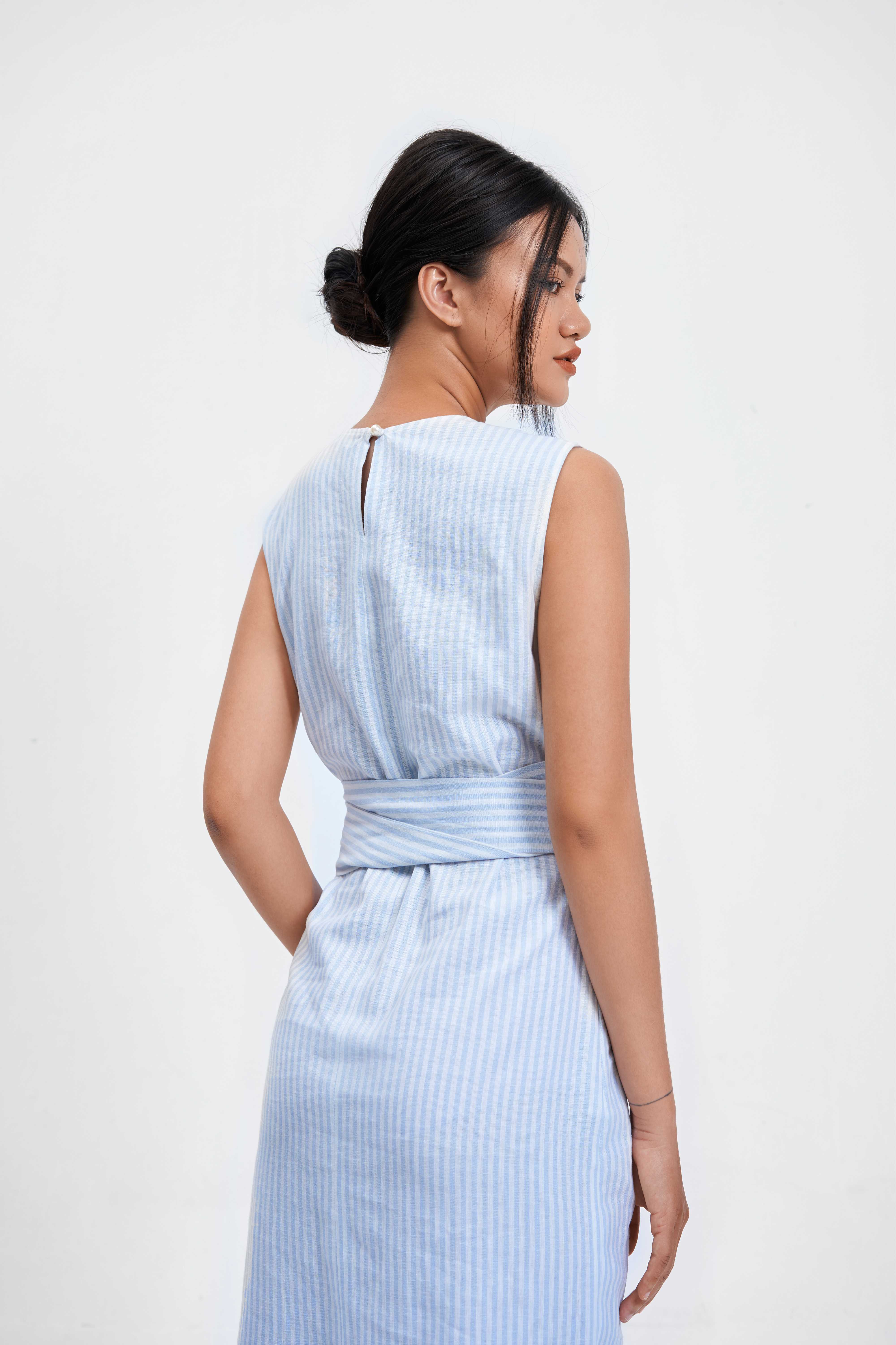 Đầm ống suông không tay, cổ tròn, freesize, đai đính liền thắt quanh eo, xẻ sau, khóa hông.