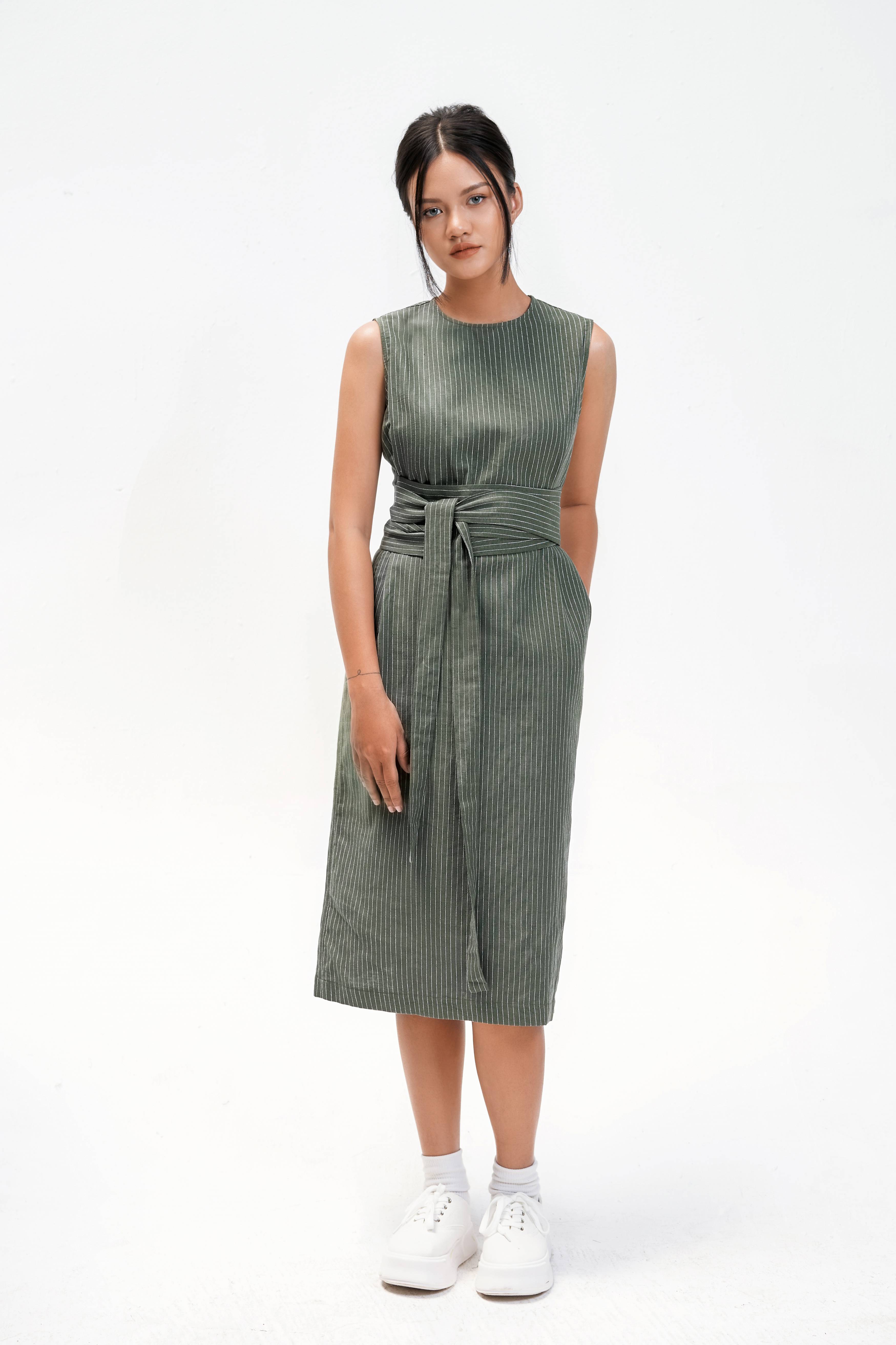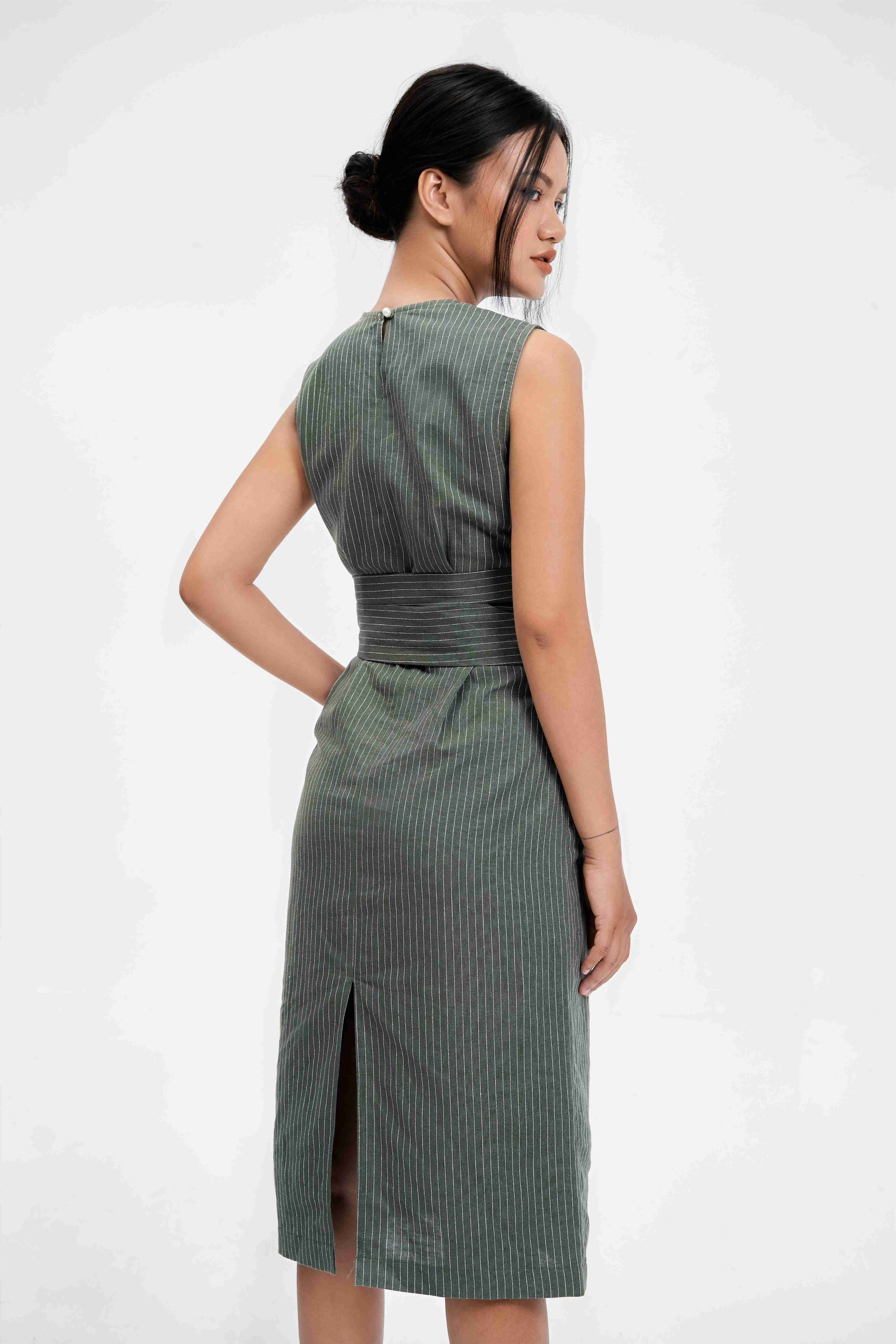 Đầm ống suông không tay, cổ tròn, freesize, đai đính liền thắt quanh eo, xẻ sau, khóa hông.