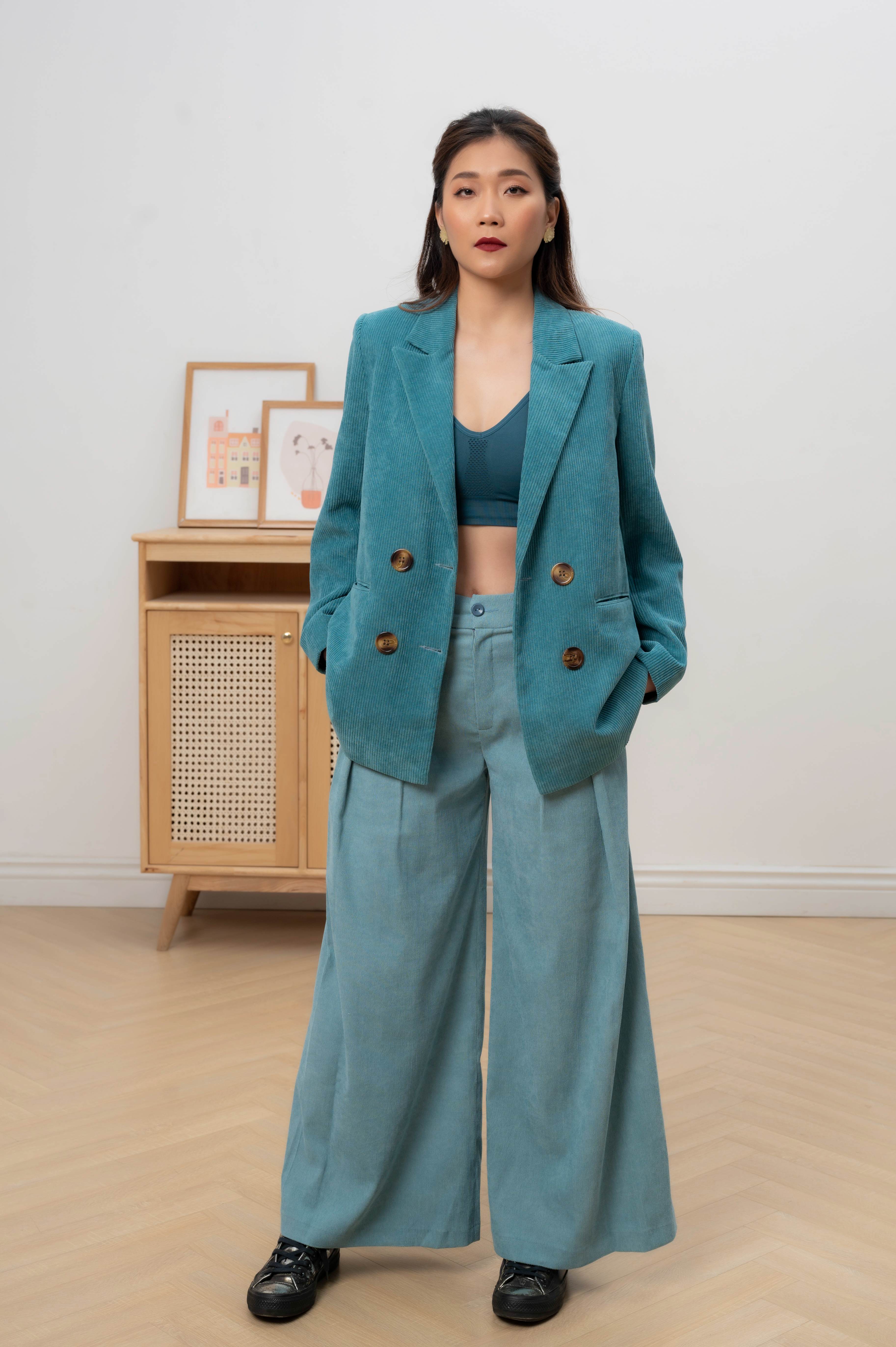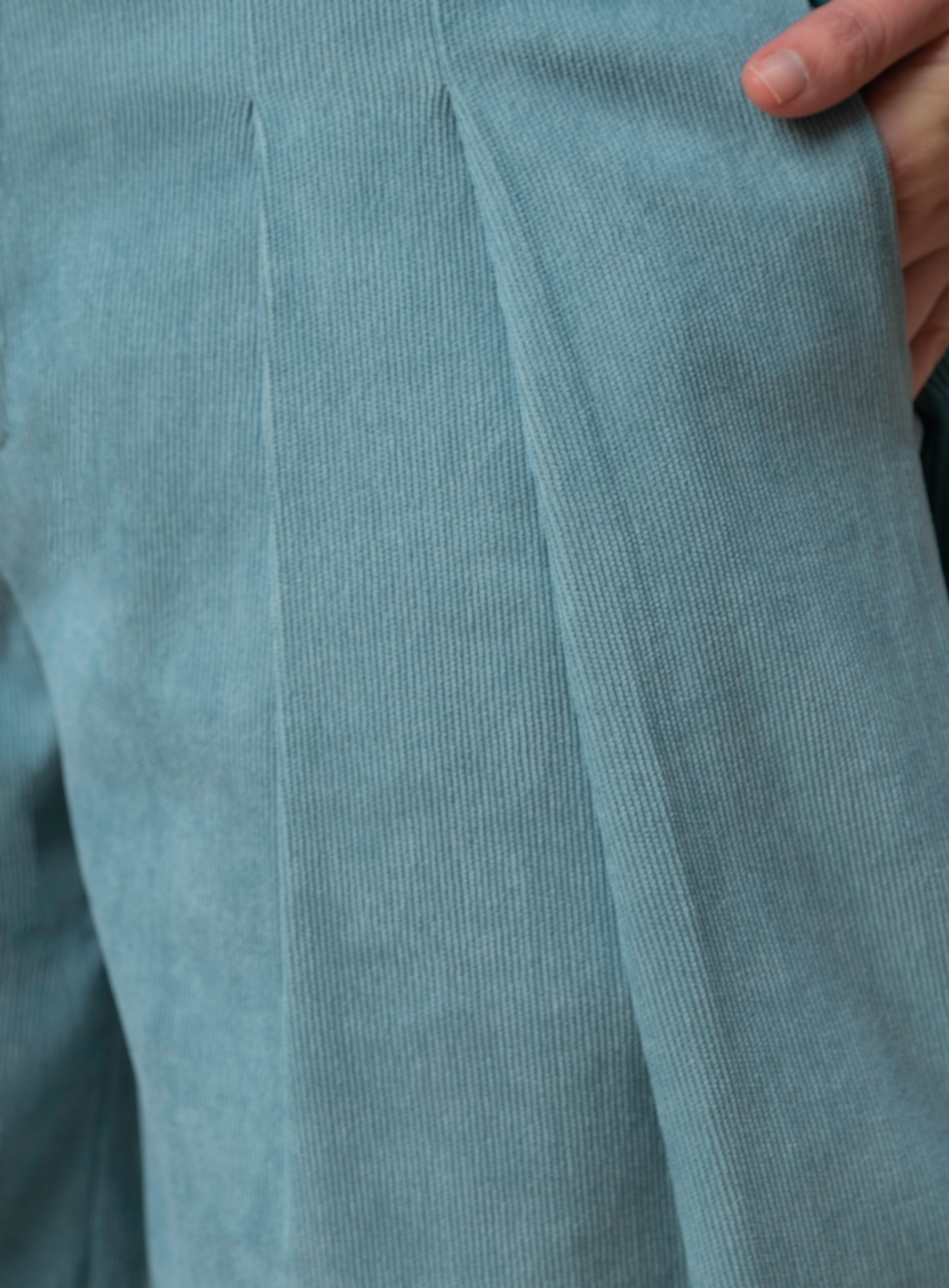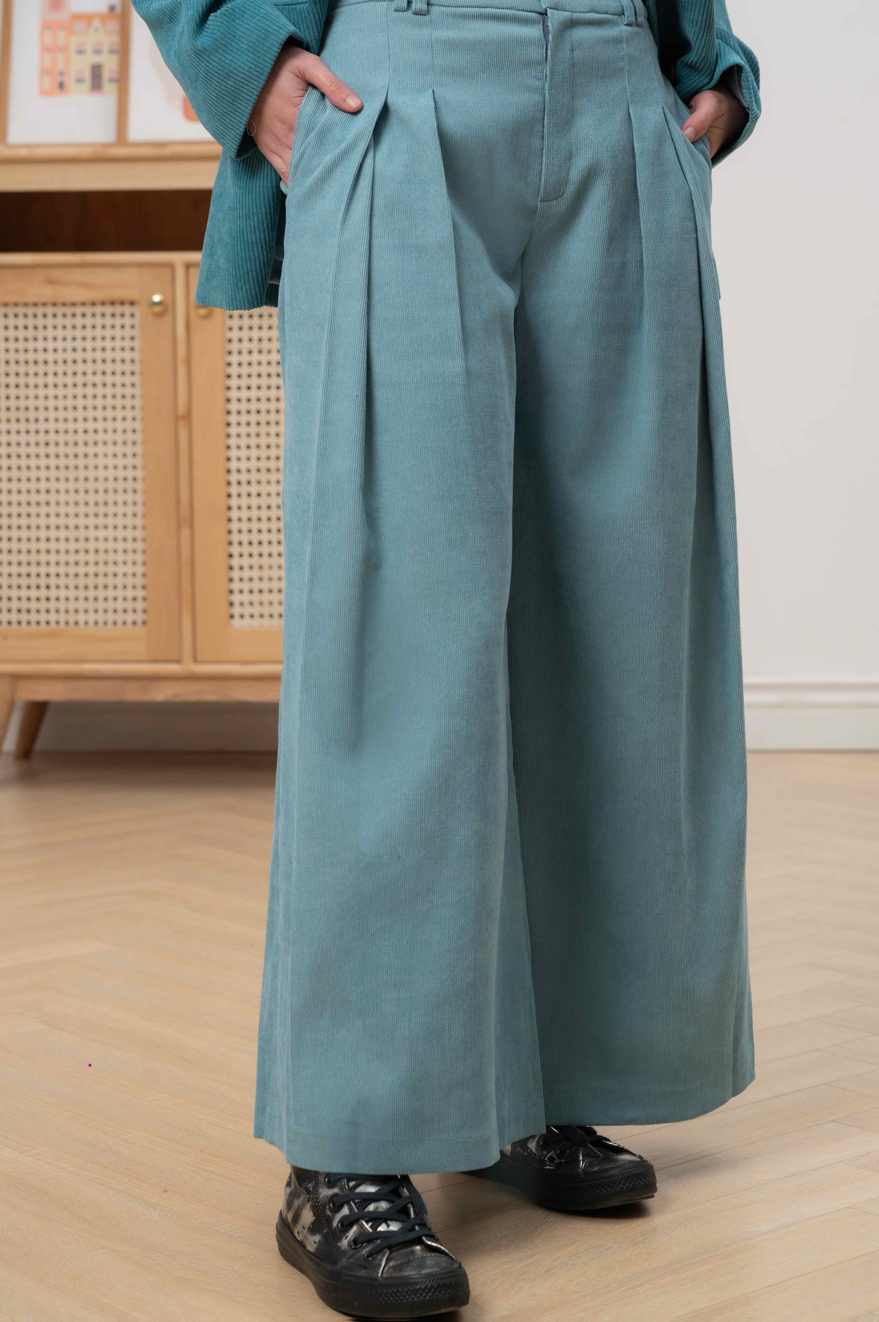 Quần kiểu ống rộng, 2 ly trước phong cách retro. Quần có túi hai bên hông, cạp thường, đóng cúc, kéo khóa trước.