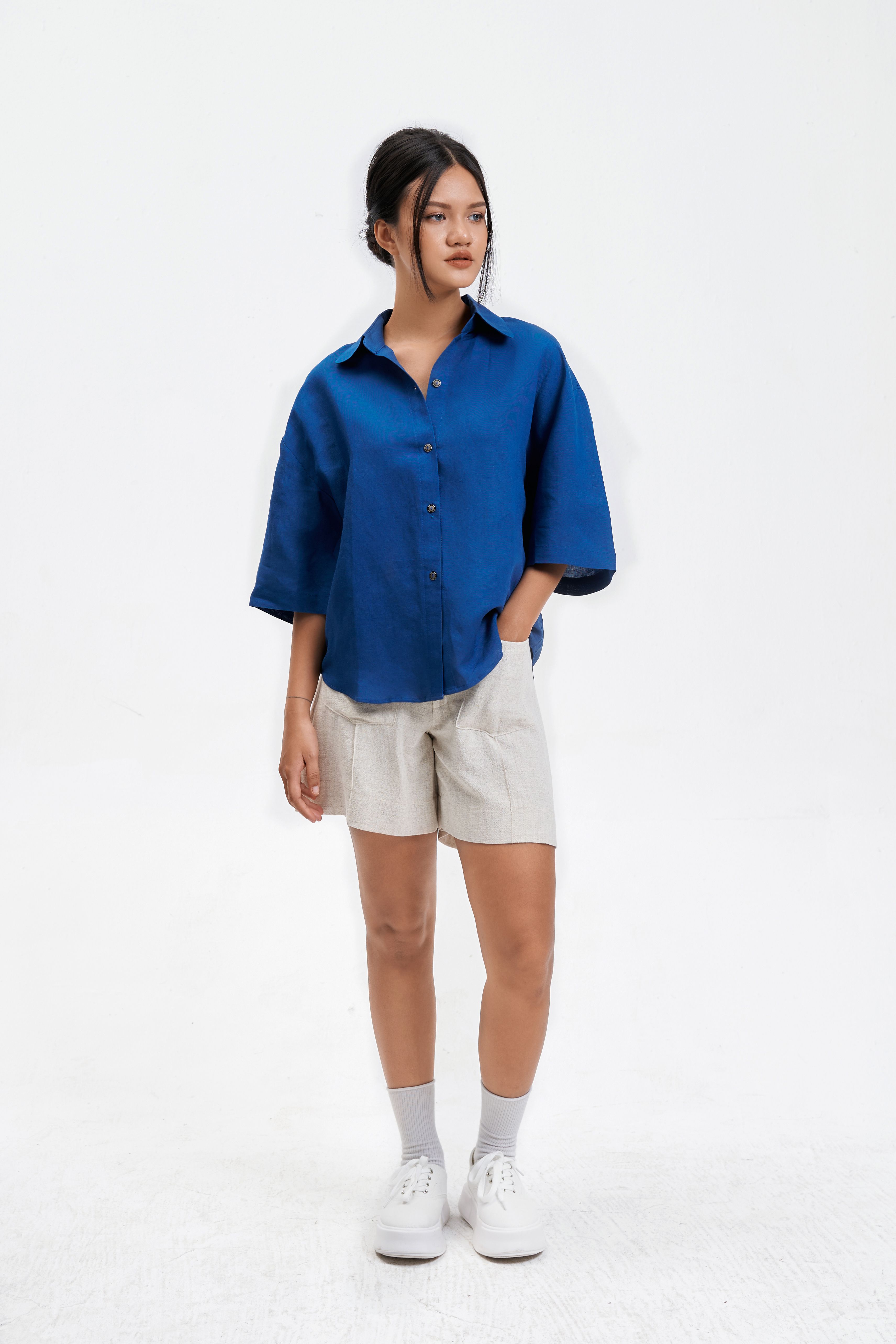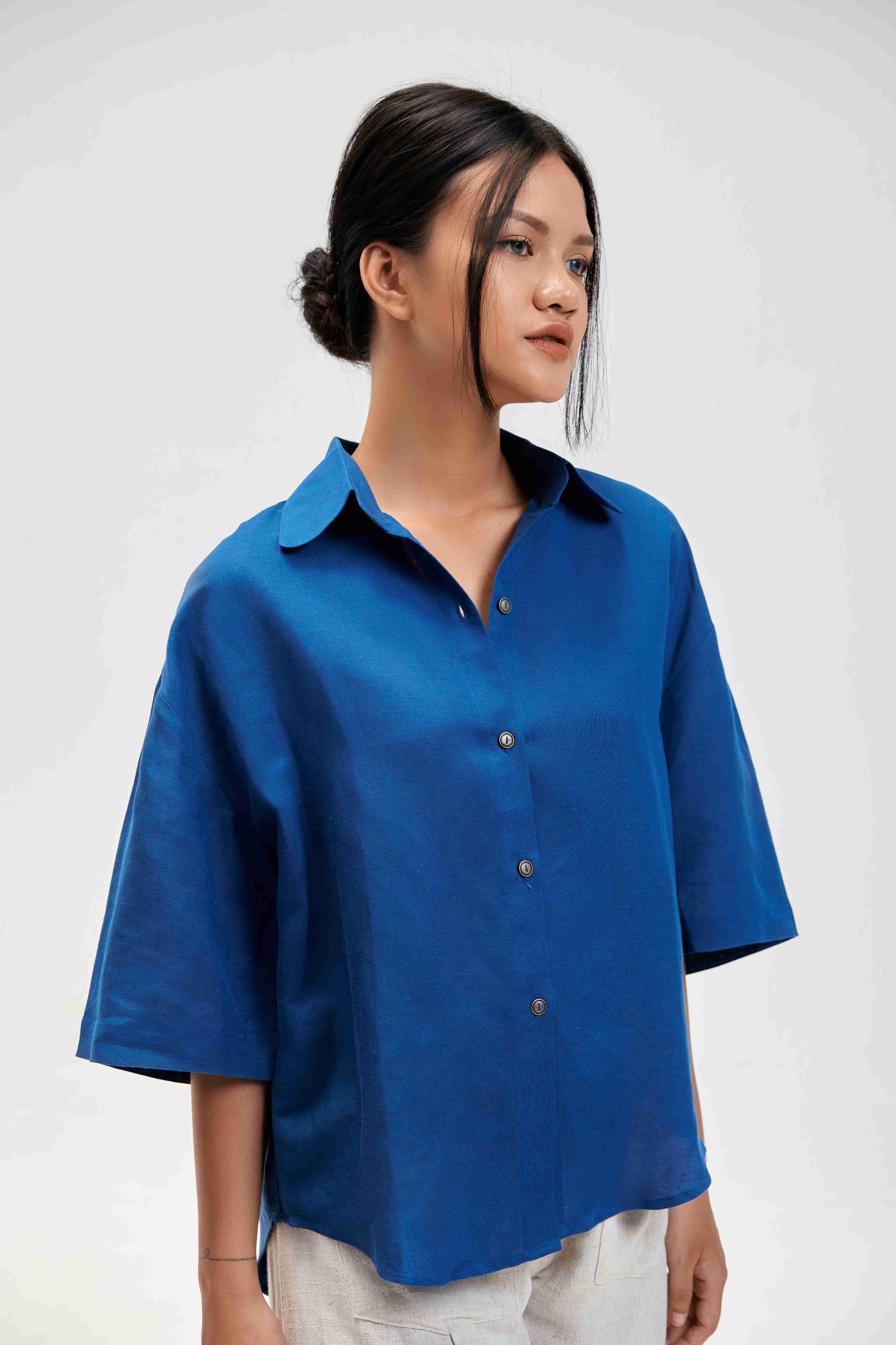 Sơ mi linen, dáng suông rộng, freesize, tay lửng. Màu xanh cobalt
